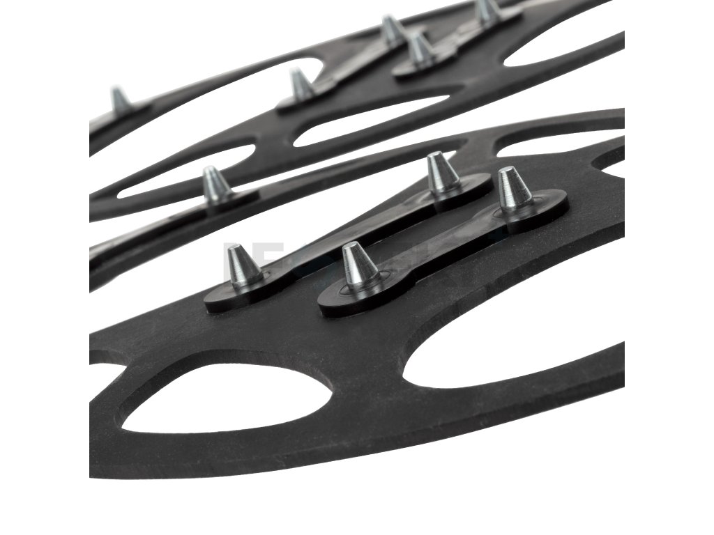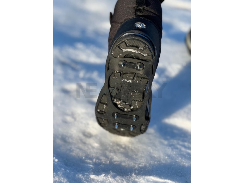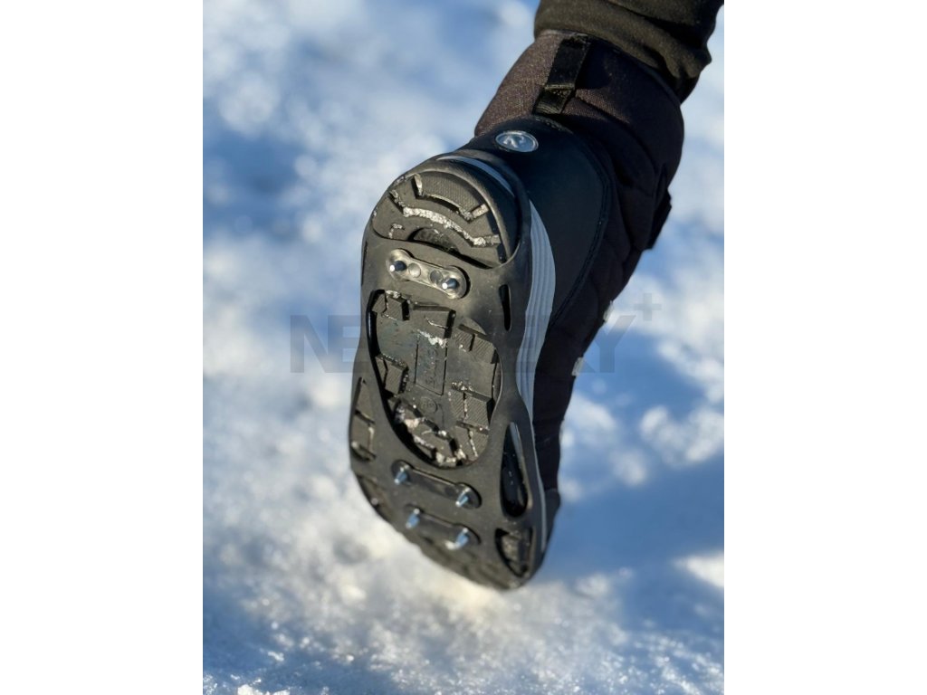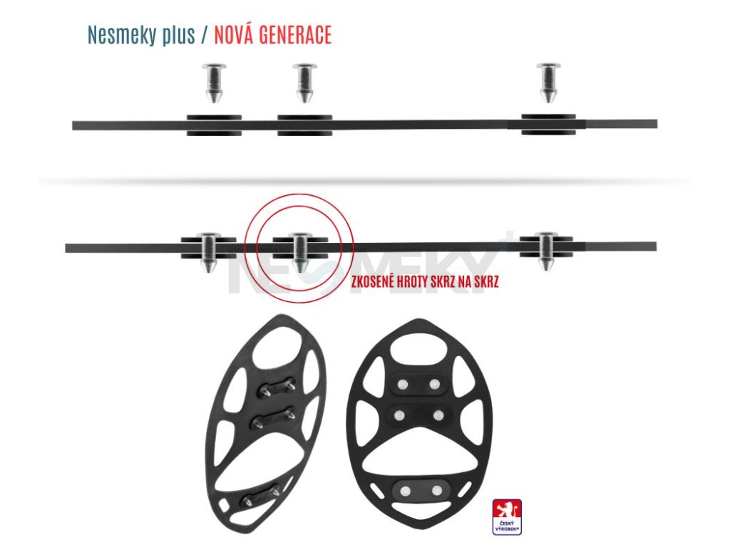 Nesmeky Plus jsou nově vybaveny šesti pevnými, zkosenými hroty (čtyři vpředu, dva na patě), které zajišťují výbornou stabilitu na kluzkém povrchu. Zkosení hrotů zároveň umožňuje krátkodobé použití v interiéru (např. pošta, obchod, lékárna) bez rizika poškození podlahy.